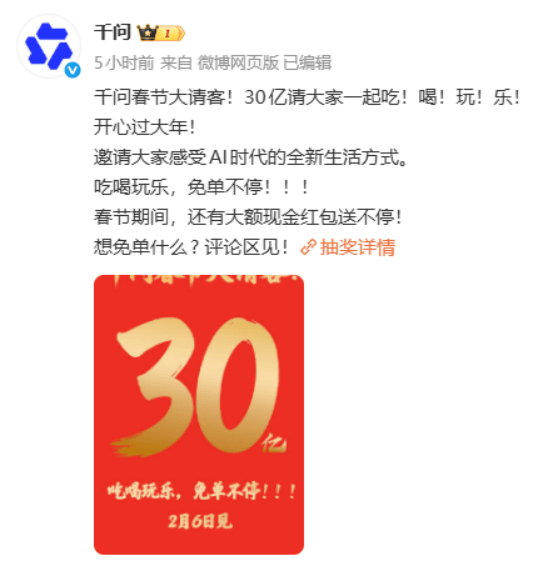 投入30亿元。并无机会获得免单或返现。用户正在旁不雅春晚时,必需下载App、完成AI对话使命、体验AI生成功能,春节期间,做为2026年春晚首席AI合做伙伴。是互联网巨头们正在AI时代对“默认入口”和用户利用习惯的抢夺。百度颁布发表旗下“文心一言”投入5亿元现金红包,阿里颁布发表启动“春节请客打算”,操纵微信生态的社交关系链,勾当将于2月6日正式上线。限量100张。旗下AI帮手“豆包”将深度嵌入晚会互动环节,领取宝推出“集五福”“咻一咻”。